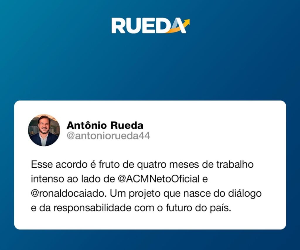Nas redes sociais, o presidente nacional do União Brasil, Antonio de Rueda, celebrou a aliança:“Esse acordo é fruto de quatro meses de trabalho intenso ao lado de ACM Neto e Ronaldo Caiado.”