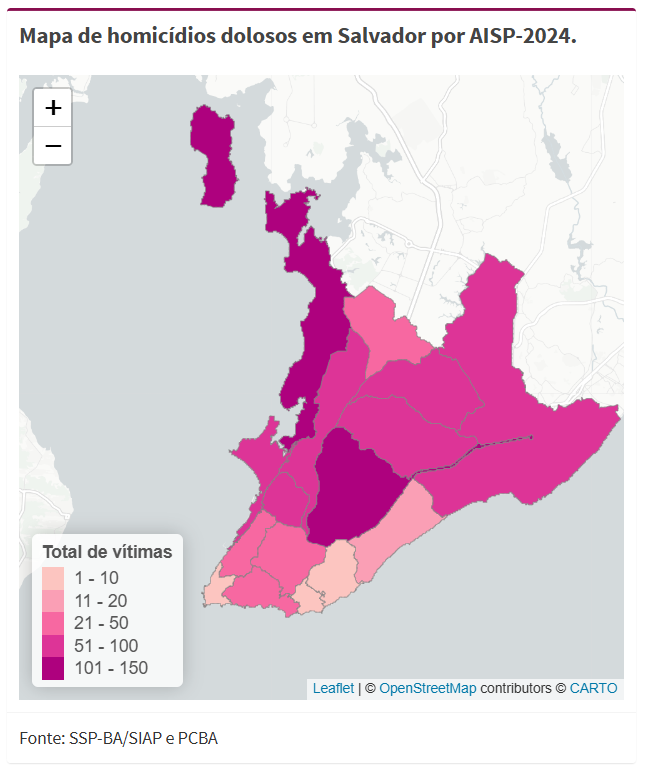 O alerta do parlamentar ganha ainda mais relevância diante dos dados recentes sobre a violência na capital. O mapa de homicídios dolosos divulgado pela Secretaria de Segurança Pública da Bahia (SSP-BA) em 2024 aponta que várias áreas centrais e periféricas de Salvador apresentam índices elevados de assassinatos, com regiões registrando entre 101 e 150 homicídios.